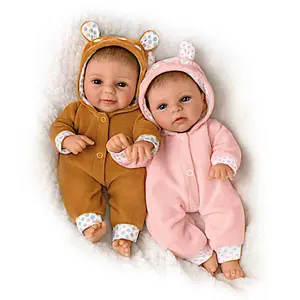 So Truly Real Sherry Rawn Oh Deer! The Twins Are Here! Vinyl Baby Doll Set Featuring Deer Inspired Outfits - Grandma was so excited to see the twins dressed in the new sleepers she'd sent over. Not only did the deer print and little hoods make them adorable, the velour fabric was so soft they had fallen asleep in each other's arms. Her heart melted in an instant, and so will yours when you bring home the Oh Deer! The Twins Are Here! Baby Doll Set, a Collector's Edition featuring two lifelike baby dolls by acclaimed Master Doll Artist Sherry Rawn, only from Ashton-Drake. Looking absolutely precious in their deer-themed sleepers, this So Truly Real® duo is expertly crafted with our soft RealTouch® vinyl to lovingly recreate Ms. Rawn's original sculpt in realistic detail.Featuring an unparalleled level of realism, from the tops of their precious heads covered with soft, natural-looking hand-rooted hair to their tiny fingers and toes, this darling set of twins must be held in your arms to be believed. Once you look into their expressive eyes, you will never want to look away and their soft baby powder scent will have you snuggling them tight. Their extra cushy sleepers, complete with ears and deer-spotted front, back and hood, ensure you won't want to put them down either. What's more, so the pair never has to be apart, their poseable arms allow them to cuddle together in any number of realistic positions. Strong demand is expected for this So Truly Real® collectible doll set, so don't delay. Order now!