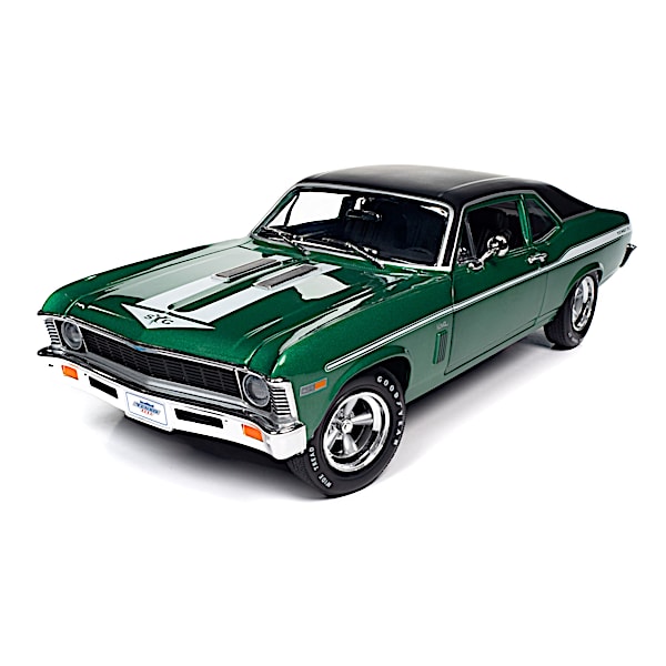 1969 Chevy Yenko Nova 1:18-Scale Diecast Car Featuring A Rallye Green Paint Finish And Rubber Tires - Custom car builder Don Yenko had a passion for Chevrolets and a talent for tuning potent muscle machines. With big-block 427 V8 engines and unique parts - some of them his own creations - he built cars with better-than-stock build quality. Although he'd hit a home run with his previous build programs, he faced challenges selling GM on his '69 Yenko/SC Nova program. With tuned engines that could reach up to 450 hp, he admitted that he was likely pushing the envelope, and that these cars were "barely legal at best!" But now you can thrill at the powerful force of these "Yenko tuned" muscle cars with the 1969 Yenko Nova Diecast Car, presented by The Hamilton Collection.This 1:18-scale diecast muscle car is precision-engineered with over 250 parts to create a quality showpiece with unparalleled detail. The opening hood and doors reveal an authentic recreation of a Yenko wired & plumbed 427-inch L72 engine and detailed interior, along with an accurate chassis, rubber tires and even steerable front wheels. This Chevy collectible boasts a Rallye Green paint finish exclusive to The Hamilton Collection, the rarest color among Yenko Nova Supercars (only three cars with this color are known to still exist). The car's nose-to-tail side stripes, twin-stripe hood arrow and Yenko fender badges distinguish the Yenko/SC Nova, while every feature transports you back to a time when small size didnt mean reduced power. Strong demand is anticipated, so hurry. Order now!
