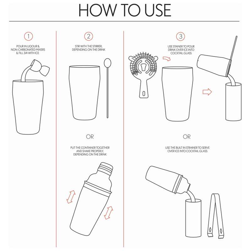 The Wyndham House 5 Pc Stainless Steel Bar Set will help you create cocktails easily and effortlessly! Set includes an 18.6 ounce cocktail shaker, stirrer, strainer, double jigger, and ice tongs. Limited Lifetime Warranty. Black gift box.
