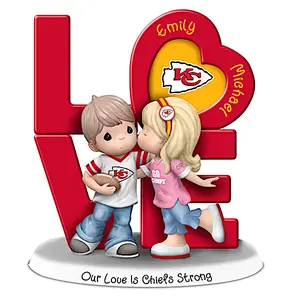 There's only one thing stronger than your passion for your favorite NFL team - your passion for each other! Now you can celebrate your dual devotion with this winning limited-edition tribute: the Personalized NFL Figurine, available only from The Hamilton Collection. Officially licensed by NFL Properties LLC, this adorable personalized figurine champions your choice of popular NFL teams. Plus, for a personal touch, both of your names are showcased in the unique design. That's a touchdown for team pride AND true love!Every detail of this NFL figurine is carefully handcrafted and intricately hand-painted to show off a precious football-loving couple, decked out in team jerseys and playfully posing in front of big, bold L-O-V-E letters. The heart-shaped letter "O" is embraced by your names, surrounding the iconic logo of your favorite professional football team. What a wonderful way to show off your mutual team love! Makes a special football fan gift too! Strong demand is anticipated, so don't delay. Order now!