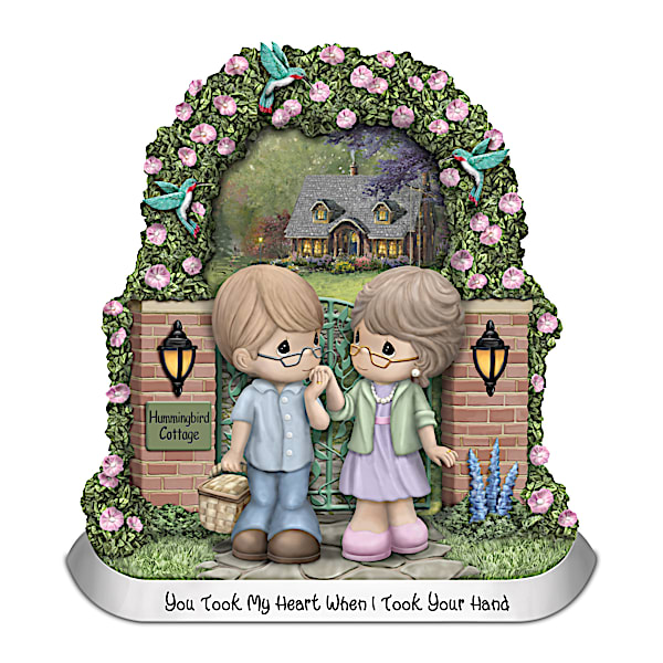You Took My Heart When I Took Your Hand Figurine Featuring Elderly Sweethearts Holding Hands & Adorned With Background Art By Thomas Kinkade Studios - Looks like this cute-as-can-be couple found the perfect cozy cottage where they can enjoy a romantic getaway...or even a happily ever after! And now, with this Precious Moments® figurine you can pay tribute to the true love you share with the most special person in your life. Introducing the You Took My Heart When I Took Your Hand Figurine, a limited edition available exclusively from The Hamilton Collection. Officially licensed by Precious Moments and Thomas Kinkade Studios, this figurine is sure to make a romantic birthday or anniversary gift to express the joy you'll share today, tomorrow and every day to come!A charming addition to your cottage decor, this heartwarming figurine is expertly handcrafted of artist's resin, then hand-painted by master artisans in soft colors with eye-catching pearlescent and metallic accents. The fully sculpted couple stands in front of a two-dimensional backdrop accented with bas-relief details, like the sweet hummingbirds happily buzzing around the blossom-filled arbor gate. What's more, the background scene features full-color imagery from Thomas Kinkade Studios' beloved "Hummingbird Cottage"! Strong demand is anticipated, so don't delay. Order now!