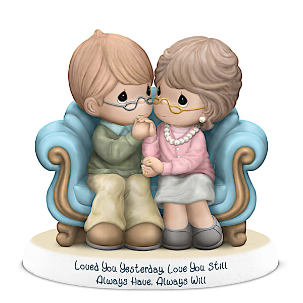 Precious Moments Loved You Yesterday. Love You Still. Always Have. Always Will. Figurine - With a gentle kiss of her hand, this charming husband lets his beloved know he'd do it all over again! Now, celebrate your own forever love with a heartwarming Precious Moments® figurine. Introducing the Precious Moments Loved You Yesterday Love You Still Figurine, available in a limited edition exclusively from The Hamilton Collection.Brimming with charming handcrafted details - from the plump, oversized couch to the happy couple sharing their teardrop-eyed expression that reflects the emotion in their hearts - every inch is crafted by hand in fine bisque porcelain. Master Artisans hand-paint your figurine in soft pastel tones, with metallic painted eyeglasses. And for a brilliant finishing touch, their wedding bands feature fired-on 22K gold for an adorable display of everlasting love. Plus, the sentiment "Loved You Yesterday. Love You Still Always Have. Always Will." is inscribed on the base of this collectible figurine. A beautiful way to celebrate your own love story or a heartwarming couple gift, this figurine is expected to prompt strong demand, so don't delay. Order now!