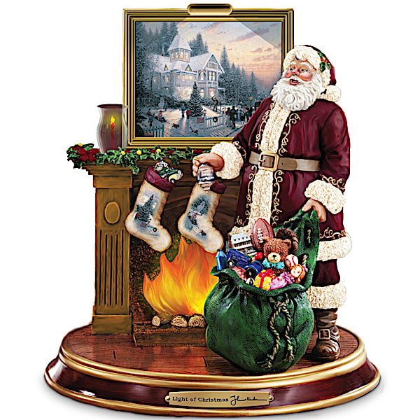 Thomas Kinkade Illuminated Santa Claus Tabletop Figurine: Light Up The Holidays - Now, just in time for the holidays, here's a classic Santa that shows you Christmas as envisioned by the Painter of Light™. The Light of Christmas is a first-of-a-kind illuminated Santa figurine featuring his artwork - exclusively from The Bradford Exchange! The picture over the fireplace, the stockings, even the ornaments are decorated with Thomas Kinkade art.And, it lights up! At the flick of a switch, cheerful light glows from the fireplace and above the Thomas Kinkade artwork. Plus, the rich golden colors, nameplate and handsome base add ideal finishing touches. Share Thomas Kinkade's vision of Christmas, but hurry! His work is in intense demand and quantities are limited, so order now.