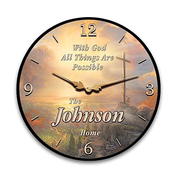 Faith For All Time 14-Inch Diameter Religious Wooden Wall Clock Featuring Thomas Kinkade Studios' The Cross Art And Personalized With Your Family Name - Time and again, the inspiring art of Thomas Kinkade is a testament to his deep faith and the glory of God's creation. Now, with every glance at this wall clock, you'll be reminded that with God, all things are possible. Introducing the Thomas Kinkade Faith for All Time Personalized Wall Clock, available exclusively from The Bradford Exchange. This handsome timepiece is personalized with your family name to show how much faith means in your home - and it makes an inspirational personalized gift for a loved one.Impressively sized at 14 inches in diameter, this handcrafted wooden wall clock proudly showcases Thomas Kinkade Studios' "The Cross" artwork, along with uplifting words from Scripture that read "With God All Things Are Possible". The golden letters, numerals, hour markers and traditional raised hands continue the warm color palette that is embraced by a sleek, black outer border. Plus, a precision quartz movement assures accurate, up-to-the-second timekeeping. Take the time for faith in your house with this lovely addition to your religious decor. Strong demand is anticipated, so don't delay. Order now!