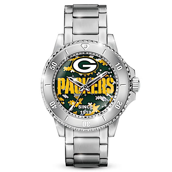 Green Bay Packers Men's Stainless Steel Watch Featuring A Digital Camo Print On The Center Dial In Team Colors - There's no better feeling than settling into your favorite spot at home to catch some Green Bay football. From incredible touchdowns to seamless field goals, each minute of game day is worth savoring. Now you can mark every minute of game day with this Green Bay Packers Men's Watch, a fine jewelry design available only from The Bradford Exchange. Officially licensed by NFL Properties LLC, this stainless steel watch is an impressive way to show your love for the game, and it makes a wonderful gift for a fellow football fan.This striking watch features a custom digital camo print in team colors on the watch face, along with the official team logo, team name, and the year the team was established. Plus, the bezel is expertly etched with second marker indices. Handcrafted with a stainless steel case back and strap, bold hands and hour markers, the watch's precision quartz movement provides dependable accuracy while the adjustable "C-clasp" allows for a comfortable fit. Strong demand is expected for this NFL jewelry design, so don't wait another minute. Order now!