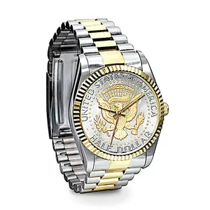 Official John F. Kennedy Half Dollar Presidential Collectible Men's Watch - John Fitzgerald Kennedy has inspired countless people with his visions for America and motivating words. You can celebrate America's 35th president with this stylish John F. Kennedy men's watch handcrafted in stainless steel with 24K gold accents. A genuine JFK Half Dollar coin reverse serves as the watch face, and features an American eagle design based on the Presidential Seal. An engraved Kennedy profile from the obverse of the JFK Half Dollar graces the back.This JFK collectors watch is a fine jewelry design exclusively from The Bradford Exchange MInt. Watch is crafted with a precision quartz movement, and features 24K gold plating on the eagle design, bezel and band. It has an adjustable clasp, and is water-resistant to a depth of 99 feet. Arrives in a custom presentation case. High demand is expected from history buffs and coin collectors, so order now!