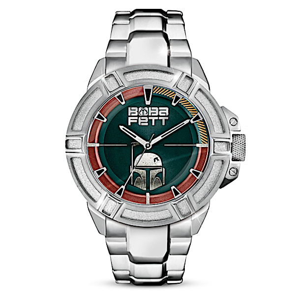 STAR WARS Boba Fett Stainless Steel Watch Featuring A Dial With The Bounty Hunter's Helmet And Name - Back to life and ready to tell his dramatic story, Boba Fett has re-emerged in his own compelling series, "The Book of Boba Fett." In fact, this STAR WARS legend and bounty hunter extraordinaire is the inspiration for this striking men's Boba Fett watch, a fine jewelry design available only from The Bradford Exchange. Capturing everything you admire about the character and his tough-guy demeanor, this distinctive STAR WARS watch features a custom-printed dial with Boba Fett's iconic helmet and name, including elements inspired by his battle-worn Beskar armor.Officially licensed by Lucasfilm Ltd., this handsome timepiece is expertly handcrafted with a stainless-steel case back and outer bezel with Beskar-like features, finished with a bracelet-style band and adjustable C-clasp. Plus, etched on the back is official Boba Fett artwork and his stylized name. To give a notable contrast to the gleaming look of this STAR WARS jewelry, the colors of red, green and yellow are hand-enameled beneath its quartz mineral lens, borrowing from Boba Fett's helmet and armor. And no matter where your next adventure takes you, you can depend on this STAR WARS Boba Fett Men's Watch, as it is engineered with precision quartz movement for accurate performance. Strong demand is expected, so don't wait. Order now!