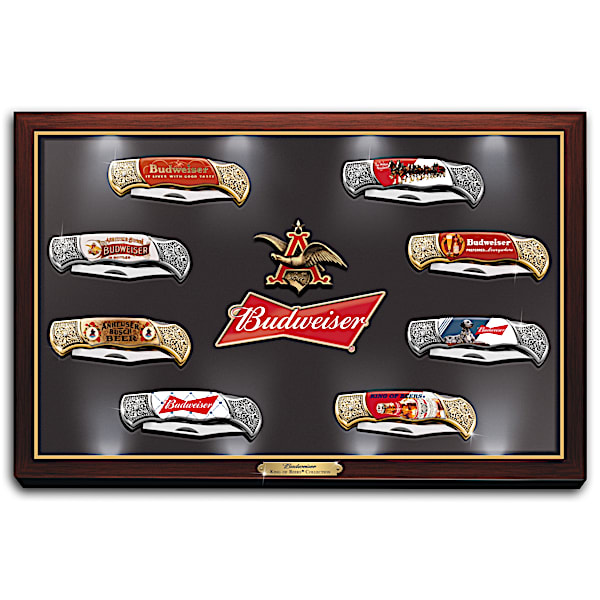 Budweiser: The King Of Beers Folding Knife Collection With Custom-Crafted Illuminated Display Case - Boasting a history as exceptional as the beer itself, Budweiser® has a long tradition of beer-making and innovation. Now, you can celebrate this American tradition with the limited-edition Budweiser: The King of Beers Knife Collection, exclusively from The Bradford Exchange. Your collection of Budweiser folding knives begins with Issue One, The World-Renowned Clydesdales. Next to arrive is Issue Two, It Lives with Good Taste. Soon your collection will continue with Issue Three, the Display, a $100 value, yours for the same low issue price as a single knife, followed by Issue Four, In Bottles, and five additional Budweiser collectible knives to complete your collection, each issue to arrive separately.Officially licensed by Anheuser-Busch, each knife in the collection is precision-crafted in stainless steel with golden- and silvery-plated antiqued filigree bolsters flanking classic Budweiser and Anheuser-Busch advertising artwork. Substantial and fully functional, each knife includes working locks, nail nicks and finger grooves. Hand-polished wood, stained in warm cherry, backs the reverse sides of the knives. The custom, glass-covered wooden display illuminates your collection with 8 built-in LED lights and includes the Anheuser-Busch and Budweiser bow tie logo along with a molded interior. This handsome Budweiser: The King Of Beers Knife Collection is sure to command a special place in your home or office. Strong demand is expected. So don't delay. Order now!