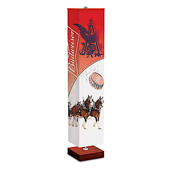 Budweiser Floor Lamp Featuring Full-Color Anheuser-Busch Art On All 4 Sides With Two Energy-Saving Light Bulbs That Illuminate The Artwork From Within - The King of Beers® always seems to brighten up a special celebration. Now you can shine the spotlight on those good times and fun memories with family and friends, complements of the Budweiser® Floor Lamp, a limited edition available only from The Bradford Exchange. Officially licensed by Anheuser-Busch®, this stylish statement lamp stands a full five feet high with Budweiser artwork and brand emblems vividly reproduced on all four sides. What a refreshing addition to the Budweiser decor in your home!A glowing tribute to the King of Beers, this fully functional lamp boasts a polished, wrinkle-resistant fabric shade to showcase the full-color Anheuser-Busch imagery, from the famed "A" logo and instantly recognizable bottle cap, to the beloved Clydesdales and festive beer wagon. All the hallmarks of Bud® come together brilliantly, set aglow by two energy-saving light bulbs, included FREE, to dramatically illuminate the artwork from the inside. Your lamp also features a sturdy wood-tone base that keeps it standing tall, and a convenient, hands-free floor pedal switch for easy on and off. Strong demand is expected, so don't wait to put a great shine on any celebration with the King of Beers®. Order now!