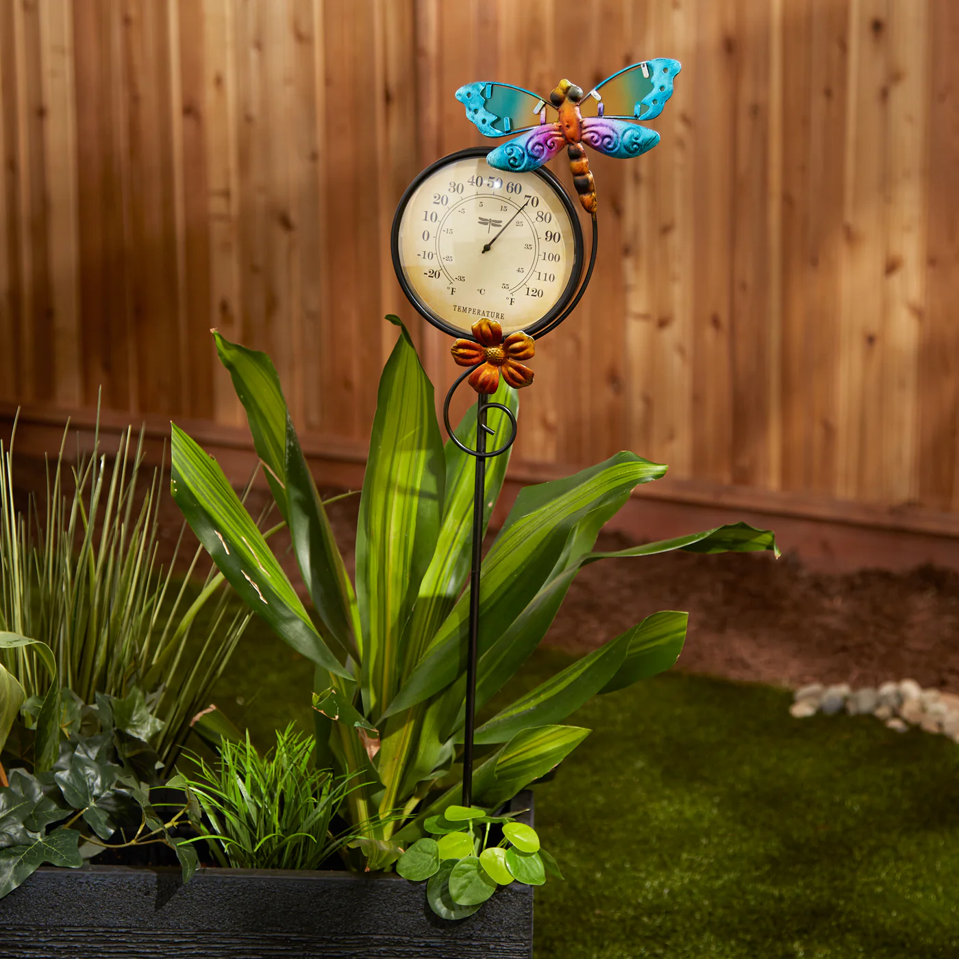 - Outdoor thermometer is made of durable iron and decorated to add charm and whimsey to your garden space.