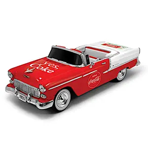 COCA-COLA 1:24-Scale 1955 Bel Air Convertible Sculpture Adorned With Authentic COKE Logos And Graphics - In the 1950s, nothing was cooler than cruising around in your Chevy® Bel Air®, with its fabulous fins, gleaming chrome trim and sleek whitewalls, and satisfying your cravings for an ice-cold, refreshing COCA-COLA. Now, bring back the classic charm of this historic decade with the 1955 Bel Air Convertible Sculpture, a limited edition available only from The Hamilton Collection. Officially licensed by The Coca-Cola Company and General Motors, this cruiser bubbles with stylish nostalgia from bumper to bumper!Expertly sculpted to collector's preferred 1:24 scale and crafted of high-quality artist's resin, this COCA-COLA collectible is hand-painted with brilliant COKE® Red finishes and features a meticulously vacuum-plated trim that glistens just like real chrome. Fueled with vintage COCA-COLA logos and graphics and authentic Bel Air detailing, from the whitewalls to the iconic fins, this sculpture is sure to make an ultra-cool addition to your Chevy decor. Strong demand is anticipated, so don't delay. Order now!
