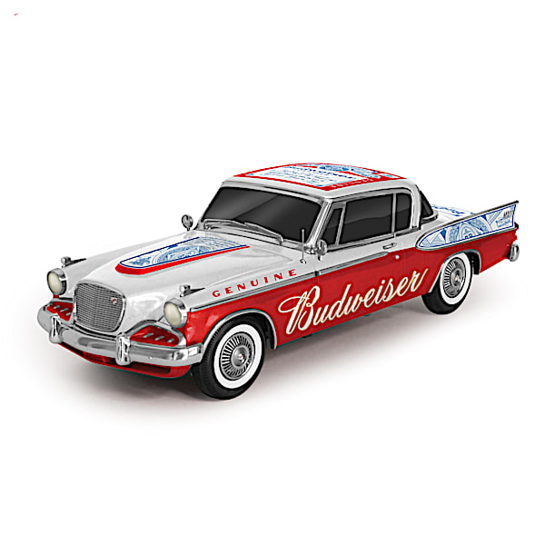 A Classic Ride 1:18-Scale 1958 Studebaker Golden Hawk Sculpture Featuring Authentic Budweiser Vintage Logos & Graphics - With an extremely limited production run of only 878 models, the hard-to-find 1958 Studebaker Golden Hawk had a style all its own. Distinguished by its uniquely shaped rear fins, hood air scoop and powerful 275-hp 289 V8 engine, it was an American classic. Now, this rare roadster pairs with another American favorite - Budweiser - with the A Classic Ride Budweiser Studebaker Sculpture, a limited-edition first-of-its-kind sculpted keepsake available only from The Hamilton Collection.Officially licensed by Anheuser-Busch, this 1958 Studebaker Golden Hawk Budweiser collectible is intricately crafted in artist's resin to a desirable 1:18 scale and emblazoned with authentic 1958 Budweiser can logos and graphics from bumper to bumper. Plus, a rear vanity plate notes the Golden Hawk's rare model year. This striking 1958 Studebaker sculpture is the perfect addition to any Budweiser decor. We expect strong demand, so, don't delay. Order now!