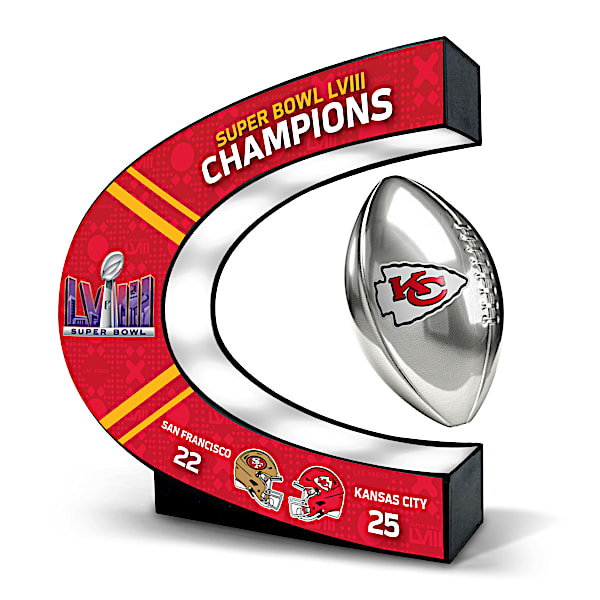 Kansas City Chiefs Illuminated Levitating Football NFL Sculpture With Super Bowl LVIII Logo - The Kansas City Chiefs are back on top of the professional sports world complements of their back-to-back Super Bowl wins. Now their gridiron greatness is celebrated with a commemorative Kansas City Chiefs sculpture. Introducing the Chiefs Super Bowl LVIII Levitating Football Sculpture, officially licensed by NFL Properties LLC and available only from The Bradford Exchange. Sure to be the centerpiece of your NFL decor, this innovative tribute features a silvery football that actually floats and spins in mid-air through the use of hidden electromagnets.The levitating football is immediately eye-catching as it rotates, suspended hands-free within its custom base. And the flip of a switch shines lights onto the football so you can admire its expert craftsmanship with authentic stipple texture, hand-painted laces and the team logo. Plus, all around the C-shaped base are memories of the big game: the Super Bowl LVIII logo and champions title, team helmets, team colors and the final score. Intense demand is anticipated for this this Super Bowl LVIII tribute, but it is offered in a strict limited edition of only 5,800 worldwide, so don't wait. Order now!