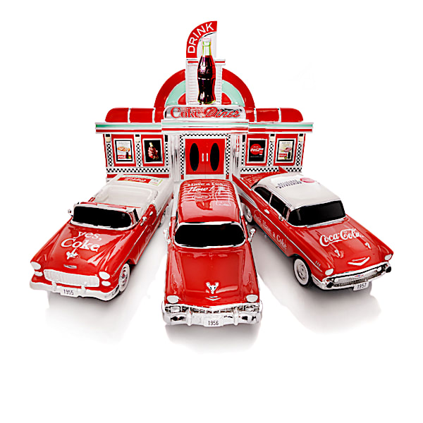 COCA-COLA Classic Refreshment Sculpture Collection Featuring A 1950s Inspired Diner & Three 1:24-Scale Chevy Bel Air Sculptures Known As The Tri-Five - Sock hops, rock and roll, drive-ins and diners serving up delicious COKE® floatsaround the clock! The '50s had it all. And now, with these Chevrolet® Bel Air® car sculptures and accompanying 1950s diner, you can relive all the nostalgic, feel-good charm of the greatest decade ever! Introducing the Classic Refreshment Bel Air Diner Sculpture Collection, a limited edition available only from The Hamilton Collection. Officially licensed by The Coca Cola Company and General Motors, this refreshing collection begins with Issue One, 1955 Bel Air Convertible and will soon continue with Issue Two, COKE Diner Display. Next to arrive will be Issue Three, 1956 Bel Air Nomad, followed by Issue Four, 1957 Bel Air Coupe to complete your collection. Each issue will arrive separately.Featured in this collection are three sculptures known as the "Tri-Five", the 1955, 1956 and 1957 model year Bel Airs which are among the world's most widely sought-after classic cars in the world. Each car is expertly sculpted to a collector's preferred 1:24 scale and crafted of high-quality artist's resin. These car sculptures are hand-painted with brilliant COKE Red finishes and feature vacuum-plated trim that glistens just like real chrome, along with vintage COCA-COLA graphics and logos. Also included in this collection is a fully sculpted diner display. With its retro design, Bel Air-inspired lines and "chrome" accents, authentic period-specific COKE posters and giant, bas-relief COCA-COLA bottle, it is the perfect place to stop for a relaxing sip! These COCA-COLA collectible sculptures are sure to make an ultra-cool addition to your at-home collection. Strong demand is anticipated, so don't delay. Order now!