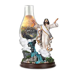 Illuminated Fluted Glass Hurricane Lantern Sculpture Adorned With Religious Art By Thomas Kinkade - Arms lifted toward Heaven, Jesus bestows a blessing. The awesome beauty of creation lies at His feet. On a distant hill, His cross shines with a divine radiance. He is Lord of all, proclaiming, "I Am the Light of the World." Now this stunning Jesus sculpture sets that powerful message aglow once again, ready to fill your home with the light of faith. Introducing the Heavens Glow Sculpture, featuring the artistry of Thomas Kinkade and available exclusively from The Bradford Exchange. Officially licensed by Thomas Kinkade Studios and handcrafted in extraordinary detail, this Masterpiece Illuminated Sculpture makes the miraculous light of Jesus a focal point in any room, and is sure to be a treasured religious gift.Standing an impressive 11 inches high, your illuminated lantern features a hand-cast, intricately detailed sculpture, individually hand-painted by skilled artisans - each is one-of-a-kind. Jesus is a compelling presence, from his compassionate features to his flowing, golden-trimmed robes. The clouds seem translucent and soft, while the waterfall appears fresh and flowing over rugged rocks. Sought-after artwork by Thomas Kinkade is skillfully hand-applied to the genuine glass hurricane lantern, retaining the breathtaking detail of the original. Flip the switch and the glow within the lantern elevates the artwork and inscription with a transcendent radiance that spills over the golden accents of the sculpture. The mahogany-finished wooden base adds a final touch of elegance, and a FREE energy-efficient C7 bulb is included. Limited release; strong demand is expected, so don't wait. Order now!