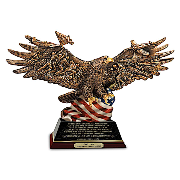 World War II 75th Anniversary Commemorative Hand-Painted Eagle Sculpture Collection With Intricate Details & Marbleized Bases - D-Day. Pearl Harbor. Iwo Jima. Merely evoking these names conjures strong emotions, somber respect and unwavering pride for the brave American heroes of World War II. Now, to mark the 75th anniversary of a war that changed our country forever, The Bradford Exchange is proud to introduce our exclusive World War II 75th Anniversary Sculpture Collection. Featuring dramatic eagle sculptures commemorating the historic battles and events of an epic world conflict, this museum-quality collection begins with Issue One, Iwo Jima. Soon, your collection will continue with Issue Two, D-Day, Issue Three, Pearl Harbor, and additional WWII 75th anniversary eagle sculptures, each a separate issue to follow.‡Each of the handcrafted commemorative WWII sculptures in this collection is grandly sized at over one foot wide and showcases a cold cast bronze eagle with outstretched wings symbolizing the soaring spirit of victory. Raised relief images of soldiers, flags, military vehicles and other WWII icons are captured within the wings to represent a specific battle, while the eagle is perched atop an American flag seemingly billowing in the wind. Hand-painted detailing brings each sculpture to vivid life and stirring words from important historic figures grace the marbleized base, along with golden trim and a woodgrain finish. As a further mark of distinction, the base features a brass-toned title plaque with the name and date of battle. Strong demand is expected for this 75th anniversary collection and it has a strict limited edition of only 7,500 complete collections. It makes an impressive statement in any room and a striking patriotic gift too, so don't wait. Order now!