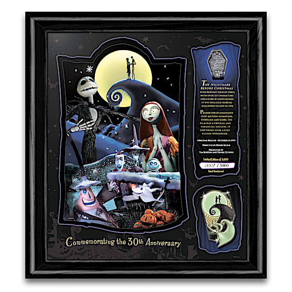 Disney Tim Burton's The Nightmare Before Christmas Wall Decor With A Glow-In-The Dark Medallion - From the moment the theater lights went down, audiences far and wide were instantly drawn into the delightfully macabre world of Disney Tim Burton's "The Nightmare Before Christmas." Full of slightly off-kilter buildings, darkly enchanting music and memorable characters, Tim Burton's stop-motion masterpiece was unlike anything they'd seen before. Now, with this The Nightmare Before Christmas framed wall decor you can celebrate three decades of Disney's fantasy masterpiece. Introducing The Nightmare Before Christmas Wall Decor, available from The Bradford Exchange.Licensed from Disney, this tribute showcases character artwork taken directly from the stop-motion film alongside details about the movie. The relief-sculpted black nickel medallion features a cutting-edge glow-in-the-dark finish making it a showstopper even at night. Professional, custom matting with a cemetery print reminiscent of the buildings and gravestones seen in the film completes this prestigious Disney collectible. The matted print arrives ready to hang in a black hardwood frame sized nearly a foot wide for impressive display in your Disney decor. And with an edition limited to 3,000 hand-numbered prints worldwide, this presentation is the perfect way to honor 30 years of spooky, musical fun in style! Strong demand is anticipated, so don't delay. Order now!This fine home decor is not intended for children.