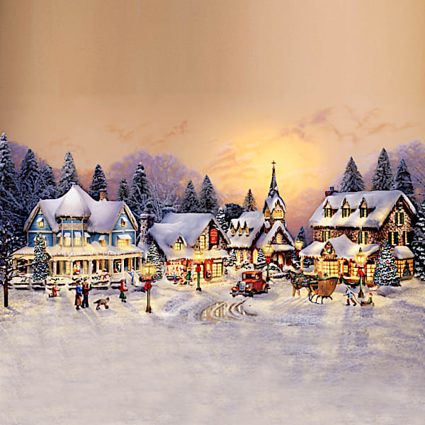 Hand-Painted Village Christmas Set Inspired By Thomas Kinkade Art Featuring An Illuminated Bed And Breakfast, Santa's Workshop, Church And House - In many of his paintings, Thomas Kinkade, the Painter of Light™, captured the essence of the holidays, bringing together everything we love about Christmas. Now all the inspiration and nostalgia of his beloved masterworks are brought to life in one illuminated Christmas village set. Begin a new holiday tradition with the Thomas Kinkade Village Christmas Set, a limited edition exclusively from The Bradford Exchange, Hawthorne Village Division. It's such a wonderful way to bring the warm and cozy feelings of the holiday season to your Christmas decor!Expertly handcrafted and meticulously painted by hand to show off a wealth of festive details, your Thomas Kinkade's Village Christmas set includes four village buildings with FREE accessories valued at $65: the Holiday Bed and Breakfast with gift bearers figurine, the Light of Hope Church with antique car figurine, Santa's Workshop Toys with sleigh figurine, and From the Heart Gifts with light set. Plus, each sculpted building lights up from inside and is inscribed with a replica of Thomas Kinkade's signature. Strong demand is expected, so hurry. Order now!