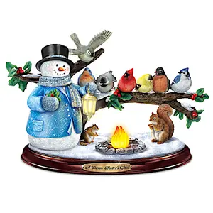 Delight in wondrous wintry gathering with this heartwarming A Warm Winter's Glow Sculpture inspired by the artistry of Thomas Kinkade. It's a magical winter's night in the heart of a forest, and the creatures of the woodland have gathered together and now you can share in their holiday spirit as well with this limited-edition Thomas Kinkade A Warm Winter's Glow Sculpture, a first-ever illuminated Tabletop Masterpiece exclusively from The Bradford Exchange. On a bed of sparkling snow, a merry snowman welcomes the tiniest woodland creatures to his wintery world with a cheerful charcoal smile, a warm fire, and joyful Holiday song!Every detail in your magical holiday sculpture has been fully sculpted, handcrafted and hand-painted. The snowman's dapper top hat, silvery knit scarf and matching mittens shimmer in the new fallen snow. The tree branch at the snowman's side showcases seven sculptures of your favorite songbirds in superb detail, from the crimson splendor of a cheerful cardinal to the sun-yellow splendor of a tiny goldfinch. Adding to the holiday spirit, your snowman sculpture plays a variety of bird songs and tweets along with a medley of 8 favorite Christmas carols! A bushy-tailed squirrel and a tiny chipmunk have joined in for the festivities, warming themselves in the glow of the snowman's lantern and warm bonfire, which lights up at the touch of a button. It's as if the snowman has orchestrated this merry moment of art and sound all by himself! Strong demand is expected, so don't delay. Order now!