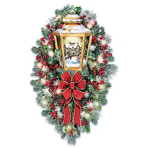 Thomas Kinkade A Happy Homecoming Illuminated Teardrop-Shaped Lantern Wreath Featuring Sculpted Victorian Scene - During the holidays, you always try to bring the joy and love of the season to your home. There are many sights that call to mind the warmest memories of winter's most wonderful time. Whether it's a family's festively-decorated home, the radiance of acclaimed artist Thomas Kinkade's beloved Victorian imagery or lifelike greenery touched with snow, these cheerful symbols of the holiday instantly greet visitors with an inviting welcome! Now, bring home these merry hallmarks of seasonal cheer with the Thomas Kinkade A Happy Homecoming Wreath. Available exclusively from The Bradford Exchange, this glowing Christmas decoration is the first-ever illuminated lantern wreath inspired by Thomas Kinkade's cherished imagery! Impressively sized at over two feet tall, this Always in Bloom® wreath is a lush and full way to welcome friends and family into your abode year after year.At the heart of this teardrop-shaped Christmas wreath is a coppery lantern containing a fully sculpted recreation of Thomas Kinkade's classic Victorian artwork, every detail expertly handcrafted and hand-painted. The artificial wreath is fashioned by hand to capture the realistic look of a variety of different fresh-cut pine boughs and beautifully decorated with an abundance of detail. You'll find frosted winter flowers hand-set among bright red holly berry clusters. And at the flip of a switch, built-in LED lights nestled throughout the wreath and within the lantern light up, creating a festive glow. For added convenience, an easy-to-set timer turns the lights on and off at the same time each night. Strong demand is expected for this one-of-a-kind Thomas Kinkade Christmas decor, so don't wait. Order now!