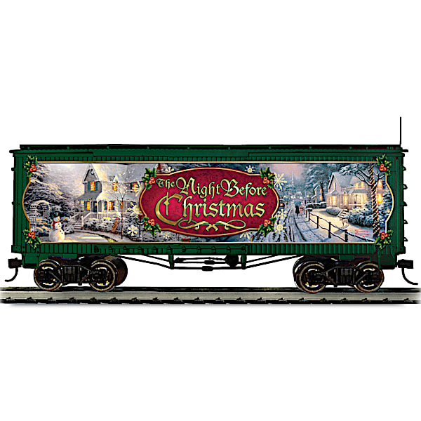 There's no time like the holidays to enjoy the heartwarming artistry of Thomas Kinkade, whose masterful vision inspires this exclusive talking The Night Before Christmas train car. Available only from The Bradford Exchange, Hawthorne Village Division, this festive box car features both the art and the voice of Thomas Kinkade! The meticulously detailed box car - designed to run on any HO-gauge track - is expertly crafted to bring you years of enjoyment. It showcases two of Thomas Kinkade's holiday masterpieces, "The Night Before Christmas" and "Hometown Christmas Memories," in full color and vivid detail. Plus, at the push of a button, you'll hear a classic recording of "The Night Before Christmas" by Thomas Kinkade. Very strong demand is expected for this unique talking Christmas train car, so don't miss out. Order now!