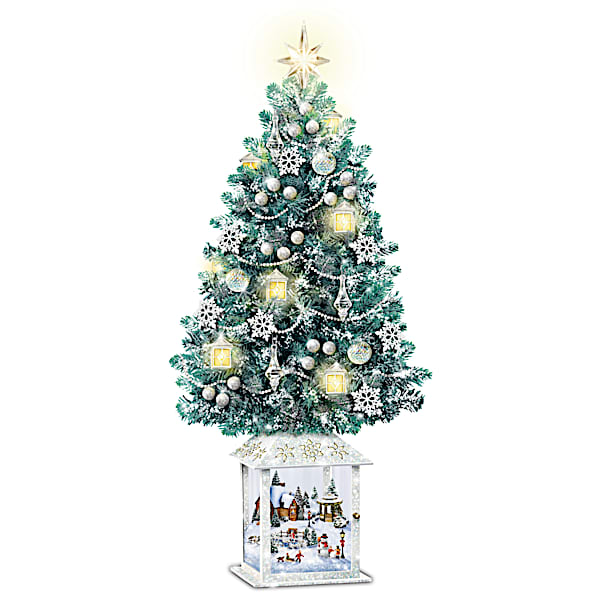 Thomas Kinkade Festival Of Lights Illuminated Tabletop Christmas Tree Featuring Snow-Tipped Branches, Pearlescent Garland & Lighted Lantern Ornaments - When the snow begins to fall all around, happy times fill the air and dazzling lights brighten our hearts and homes - Christmas is bound to be more dazzling and beautiful than ever! Now you can bring the joy of holiday lights to your home with the Thomas Kinkade Festival of Lights Christmas Tree, a first-ever Thomas Kinkade tabletop Christmas tree featuring a swirling light show of spinning snowflakes, available exclusively from The Bradford Exchange. Peer inside the unique lantern design of this Masterpiece tree to discover the vividly recreated, three-dimensional Thomas Kinkade holiday scene. From the miniature home to the merry townspeople and colorful decorations, every detail is crafted and painted by hand. Impressively sized at 2 feet tall, this intricately crafted work of art is perfect for your Christmas decor and sure to be cherished during the holiday season.The beautiful tree on top of the lantern base has been crafted with realistic-looking branches touched with "snow," creating the perfect showcase for an amazing extravaganza of ornaments: icicle-inspired teardrops, silvery ornaments with glitter, intricately styled snowflakes, pearlescent garlands and tiny lanterns that illuminate. As an elegant finishing touch, a lighted silvery star at the top radiates with its own light. Best of all, at the touch of button, a specially designed mechanism concealed on the inside of the lantern's top turns and begins to rotate, sending white light through every opening of the lantern. Moving patterns of lighted snowflakes in varying shapes will appear on the wall and surface surrounding the lantern. They swirl through the air, inviting you into this amazing show of light and motion. A 24-hour timer controls the lights for your convenience. Demand is expected to be high, so don't miss out on this enchanting Christmas tr