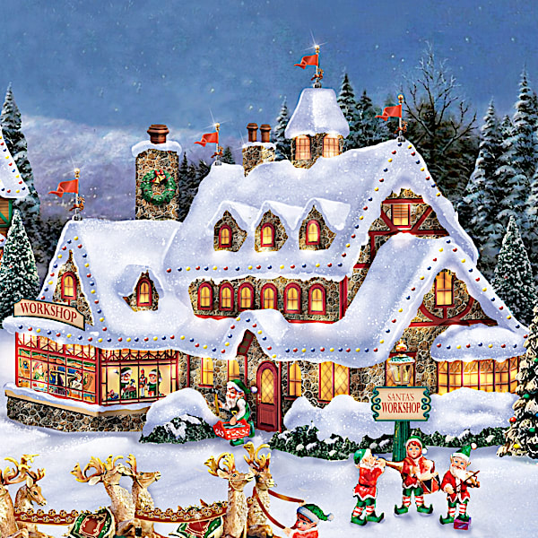It's time for a merry visit to Thomas Kinkade's North Pole Village! Inspired by the warm nostalgia found in Thomas Kinkade's beloved Victorian art and available only from The Bradford Exchange, Hawthorne Village Division, the Thomas Kinkade North Pole Village Collection is the perfect place to enjoy a good old-fashioned happy holiday, starting with Issue One, Santa's Workshop with FREE ELF Delivery Figurine Set. Next to arrive will be Issue Two, Reindeer Stables with FREE Pulling at the Reins Figurine Set. Soon your collection will continue with Issue Three and additional Thomas Kinkade North Pole Village sculptures, each a separate issue, including one more free figurines sets, will follow.Welcome to the kind of North Pole village that only the Painter of Light™ could have imagined! In fact, many of the buildings in this North Pole Christmas village collection are re-imagined from some of your favorite Thomas Kinkade artworks. Each building and figurine is individually handcrafted in beautifully detailed artist's resin, and fabulously hand-painted with the most delicate of brushes in a multitude of bright Christmas hues. These hand-assembled, merrily decorated buildings are illuminated from within, filling the North Pole Square and the long Arctic night with inviting light. And the three FREE figurine sets, a $45 value, with your collection, bringing this heirloom quality North Pole Village to life and help set the jolly scene you and your family are sure to visit and re-visit for years to come. But strong demand is expected so don't delay. Order now!