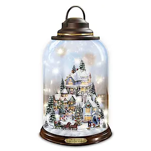 Thomas Kinkade Home For The Holidays Illuminated Glass Lantern Featuring A Hand-Painted Christmas Village & Twinkling Lights - Thomas Kinkade's beloved Christmas scenes of festively decorated homes laden with snow and glowing from within have a special way of filling our hearts with holiday wonder. They beckon us inside to share memorable moments that only Christmastime can bring. Now, you're invited to bask in the warm glow of holiday splendor with the Thomas Kinkade Home for the Holidays Lantern, a limited-edition first ever exclusively from The Bradford Exchange. This never-before-seen presentation features an enclosed domed lantern design crafted of crystal-clear glass that contains a quaint Thomas Kinkade Christmas village in fully sculptural form. Soft lights glow from stately homes as joyous revelers bustle around in preparation for the approaching holiday. Each detail of this sculpted scene is intricately hand-cast and hand-painted for superb realism.You'll find shimmering "snow" lining the eaves of the Victorian-style homes and bright green boughs of towering evergreens surrounding them. Excited children build a smiling snowman in the merry lights of twilight and an old-fashioned, horse-drawn sleigh carries a happy family home for the holidays. This meticulously designed masterpiece of Christmas decor has been crafted with starry lights tucked within and above the idyllic Christmas scene, creating a radiant work of art that's marvelous to behold day or night. For the ultimate in convenience, the lights operate on an easy-to-use 24-hour timer that automatically turns them on and off at the same time each night. A handsome wood-toned base with a golden title plaque serves as a rich finishing touch. Strong demand is expected for this first-of-a-kind Thomas Kinkade collectible, so don't delay. Celebrate the joys of being home for the holidays through the enchanting artistry of Thomas Kinkade and order now!