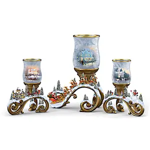 Illuminated Candleholder Set With Hand-Painted Scenes Inspired By Thomas Kinkades Holiday Paintings - Thomas Kinkade's holiday paintings are timeless celebrations of home, family and nostalgia. A master of light, his brilliant depictions of holiday traditions instill a sacred balance of hope and goodwill to all. And now, with this set of candleholders featuring glowing flameless candles and beloved Thomas Kinkade art, you can let his holiday light guide you home. Introducing the Bright Holiday Memories Candleholder Set, a limited edition available exclusively from The Bradford Exchange. Inspired by Thomas Kinkade's luminous artistry and meticulously handcrafted of artist's resin, each sculptural, hand-painted candleholder in this three-piece set depicts a spectacular scene filled with holiday festivities, highlighted by brilliant golden accents. From carriages filled with loved ones arriving from afar, to Santa's magnificent sleigh and reindeer, to children playing in the snow beneath a jolly snowman's gaze, each is a wintry wonderland of holiday joys!Atop each intricately detailed sculptural scene a glass votive showcases one of Thomas Kinkade's most admired holiday paintings, including "Victorian Christmas II," "A Holiday Gathering," and "Victorian Christmas." Each is expertly recreated in full-color and enhanced with frosted finishes reminiscent of a sparkled pane of glass on a frigid winter's morning. At the touch of a switch, the included flameless candles illuminate, bringing Thomas Kinkade's imagery to life with a welcoming glow. For your convenience, the tealights are then controlled by 24-hour timers to create a cozy holiday ambiance at the same time every night, brightening your Christmas decor and inspiring warmth and good cheer for all. Strong demand is anticipated, so don't delay. Order now!
