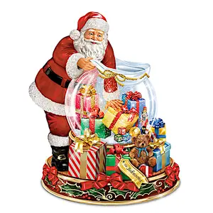 Thomas Kinkade Wishes Come True Personalized Snowglobe Featuring Fully Sculpted Santa Claus Figure & Sculpted Wood-Tone Base With Decorative Holly Leaves & Bows - The wonder of Christmas is epitomized by that magical moment when Santa Claus reaches into his bag to deliver pure joy for the good little boys and girls around the world. Now, in the twinkling of an eye, that moment is perfectly captured in this enchanting collectible snowglobe with a unique breakthrough design. Prepare to experience the holiday as never before with the Thomas Kinkade Wishes Come True Personalized Snowglobe, an innovative first-ever available only from The Bradford Exchange. Intricate sculpting, music, motion and lights unite beautifully in this limited-edition presentation that is sure to be the focal point of your Christmas decor. Best of all, this very special snowglobe features a golden gift tag that is personalized with your family's name or that of a gift recipient, to make it a one-of-a-kind holiday treat.Individually hand-cast and completely painted by hand, this collectible snowglobe breaks the barrier between the external world outside the globe and the magical contents within. A fully sculpted Santa figure seemingly reaches into a sealed, clear glass water globe that doubles as his legendary toy bag. The effect is remarkable! The glass sack holds an assortment of delightfully wrapped gifts inside, complemented with even more wrapped presents around the sculpted wood-tone base, including one with your personalized gift tag. Decorative holly leaves and bows add the perfect finishing touches. With just the touch of a switch, a built-in circulator starts a continuous flurry of glitter inside the globe, which also illuminates, all to the soundtrack of 8 classic Christmas carols in a heartwarming medley. You can even control the multiple functions of the snowglobe with a convenient 24-hour timer. Strong demand is anticipated for this novel holiday first and you don't want to miss add