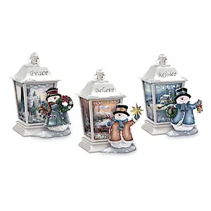 Lights Of The Holiday Illuminating Lantern Collection Featuring Thomas Kinkade Christmas Artwork Adorn Each Side With Hand-Painted Snowman Figures - Snowmen love celebrating the timeless joys of the holiday season as much as the rest of us. From the buttons on their fur-lined winter coats to the tops of their snow-frosted stovepipe hats, theyre all smiles with festive holiday spirit. Now, you can evoke wonderful memories of the holidays with this collection of illuminating Christmas lanterns, inspired by the classic imagery of Thomas Kinkade's most beloved winter scenes. Introducing the Thomas Kinkade Lights of the Holiday Lantern Collection, available in a limited-edition only from The Bradford Exchange. This cheery collection begins with Issue One, Peace. Soon, your festive collection will continue with Issue Two, Believe followed by Issue Three, Rejoice and additional Thomas Kinkade holiday lanterns, each a separate issue to follow.‡Filled with an abundance of warm illumination and timeless style to add to your Christmas decor, each of the custom-designed lanterns in this collection is meticulously handcrafted in artist's resin and inscribed with its title in elegant script. Thomas Kinkade's beloved holiday artwork adorns all four sides, recreated in rich color and detail and illuminated from within by soft LED lighting. On the outside and shimmering with a dusting of glittered sparkle, a fully sculpted and hand-painted snowman stands as adorably as can be upon a layer of glistening "snow," bundled up in his winter best. Convenient 24-hour timers automatically turn your lanterns on and off at the same time each night. Strong demand is expected for these holiday keepsakes, so don't delay. Order now!