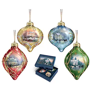 Thomas Kinkade LED Light Up The Season Collection Hand-Blown Glass Ornaments - Holiday lights have a magical effect on the Christmas season. They inspire feelings of nostalgia and joy among the many people who witness their enchanting beauty. Now, you can enjoy the season of lights right in your home with the Thomas Kinkade Light Up The Season Ornament Collection, a first-of-its-kind collection of LED hand-blown glass ornaments, exclusively from The Bradford Exchange. Arriving in sets of four, your collection of illuminating glass ornaments begins with Issue One: 4 unique ornaments showcasing Mr. Kinkade's holiday art. Soon your collection will continue with Issue Two, and additional sets of four glass ornaments, each set a separate issue to follow.Each unique holiday artwork of Thomas Kinkade is gorgeously illuminated with miniature LED lights; the lights are directly incorporated into each ornament's golden capper in a design innovation premiere. A built-in timer in each ornament turns them on automatically every night at the same time for six hours of enjoyment. Each ornament is also elegantly hand-blown in classic teardrop shapes by artisans and features a unique "crackle" pattern on the glass. Gleaming finishes of vibrant red, blue, green and gold serve as the perfect finishing touches on the ornaments. And golden and silvery swirls of glitter, faceted simulated jewels and glittered snowflake and star patterns complement Thomas Kinkade's holiday scenes. Each set of four illuminated glass ornaments arrives in a custom-made collector's keepsake box featuring Thomas Kinkade artistry on the lid. Heavy demand is expected for this limited-edition ornament collection, so don't wait. Order now!