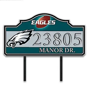 Philadelphia Eagles Personalized NFL Outdoor Address Sign Featuring Team Logo & Colors - Want to show guests to your home that you're a diehard Philadelphia football fan? Now, you can let them know where your allegiance lies before they even walk through the door with an outdoor address sign that salutes the gridiron giants of Philadelphia. Introducing the Philadelphia Eagles Personalized Address Sign, available only from The Bradford Exchange. This officially licensed NFL decor is personalized with your address, and arrives with metal yard stakes and hanging hardware, so you can proudly display your address sign in your yard, on your front door or garage, or on the wall in a room - wherever you'd like a dose of winning spirit!Impressively sized at over one foot wide, your personalized address sign is expertly crafted of sturdy metal. The team name, logo and bold colors are expertly printed to complement your personal address at the center. Then, the sign is masterfully coated with a clear finish to make it durable and weather resistant. A fan-tastic way to show your Philadelphia football devotion, it also makes a thrilling personalized gift for a fellow fan! Strong demand is anticipated, so hurry. Order now!