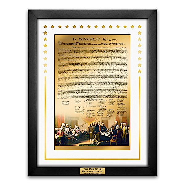 24K Gold Heirloom-Quality Declaration Of Independence Framed Masterpiece Wall Decor Featuring A Vivid Color Rendition Of John Trumbull's Famous Painting Of The Second Continental Congress - In 1776, Richard Henry Lee introduced a resolution stating that the United States "is and should be declared free from Great Britain." This seed of truth, along with Thomas Jefferson's unprecedented statement of human rights, would lay the groundwork for our freedom and the drafting of the most important document in American history. Now, the 24K Gold Declaration of Independence Masterpiece Wall Decor captures that precious manuscript as never before, in this exclusive presentation only from The Bradford Exchange Mint. Witness the iconic words and signatures of the Declaration of Independence paired with a vivid color rendition of John Trumbull's famous painting of the Second Continental Congress. Printed with a proprietary process upon a mirror-like surface of 150 mg of pure 24K gold - more than 120 square inches - adding dramatic depth, beauty and gold's enduring value. This heirloom-quality work of art is sure to bring a revolutionary inspiration to your patriotic decor for years to come.Professionally crafted with precision in a museum-quality wall plaque, the Declaration of Independence and Mr. Trumbull's iconic painting are professionally double matted and secured within a black satin wooden frame under protective glass. The 24K gold presentation is further enhanced with golden accents for an even greater impact. There is even a golden title plaque at the bottom of the frame, conveniently equipped with hanging hardware so it is immediately ready for display. Offered in an edition strictly limited to 1,776, intense demand is anticipated for this unprecedented Declaration of Independence wall décor. It is sure to be sought after by art collectors, history buffs and patriotic Americans. It also makes quite an impressive patriotic gift, so don't wait. Order now!