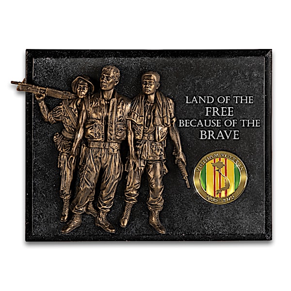 Pride And Brotherhood Vietnam Veterans Commemorative Wall Decor Featuring A Recreation Of F. Hart's Sculpture "Three Soldiers" On A Marbleized Plaque With An 18K Gold-Plated Vietnam Veteran Medallion - For the brave individuals who answered their country's call, their experiences as Vietnam veterans formed a brotherhood like no other. Now, this limited-edition Pride and Brotherhood Wall Decor offers the perfect tribute to all who have served. This patriotic plaque is ideal as a symbol of pride in your own home and it makes an impressive, inspirational gift for military vets. A Bradford Exchange exclusive, it features a stunning recreation of artist F. Hart's revered Vietnam Veterans memorial sculpture "Three Soldiers" and is expertly handcrafted in cold-cast bronze with dramatic multi-patinaed finishes.You are sure to be moved by every intricate detail of this raised-relief sculpture, from the soldier's expressive faces to the creases in their Vietnam era uniforms. This unique wall decor is presented upon a substantial wall-hung plaque and complemented by the stirring words "LAND OF THE FREE BECAUSE OF THE BRAVE". An 18K gold-plated metal Vietnam Veteran medallion is embedded within the marbleized plaque. Strong demand is expected for this commemorative limited edition, so don't wait. Order now!