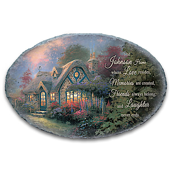 Where Love Resides Oval Wall Decor With The Look Of Stone Adorned With Cottage Art By Artist Thomas Kinkade And Personalized With Your Family Name - Thomas Kinkade had a special way of suggesting the heartwarming togetherness that dwelt just beyond the glowing windowpanes of his world-famous cottages. Now, that wonderful, cozy feeling embraces your family in its warmth with the Thomas Kinkade Where Love Resides Personalized Wall Decor, available exclusively from The Bradford Exchange. Personalized with the family name of your choice, this wall plaque is sure to make a comforting addition to your cottage decor and the perfect personalized gift.Impressively sized at nearly 14 inches wide, this plaque is expertly handcrafted of weather-resistant artists' resin that is hand-painted to capture the fashionable look of weathered stone and is ideal for indoor or outdoor use. Mr. Kinkade's acclaimed painting "Candlelight Cottage" is hand-applied by skilled artisans, retaining every intricate shading and detail of the original. A loving message that incorporates your family name reads, "where Love resides, Memories are created, Friends always belong, and Laughter never ends." Plus, this wall plaque arrives ready to hang, so you can start enjoying its charming beauty right away. Strong demand is anticipated, so don't delay. Order now!